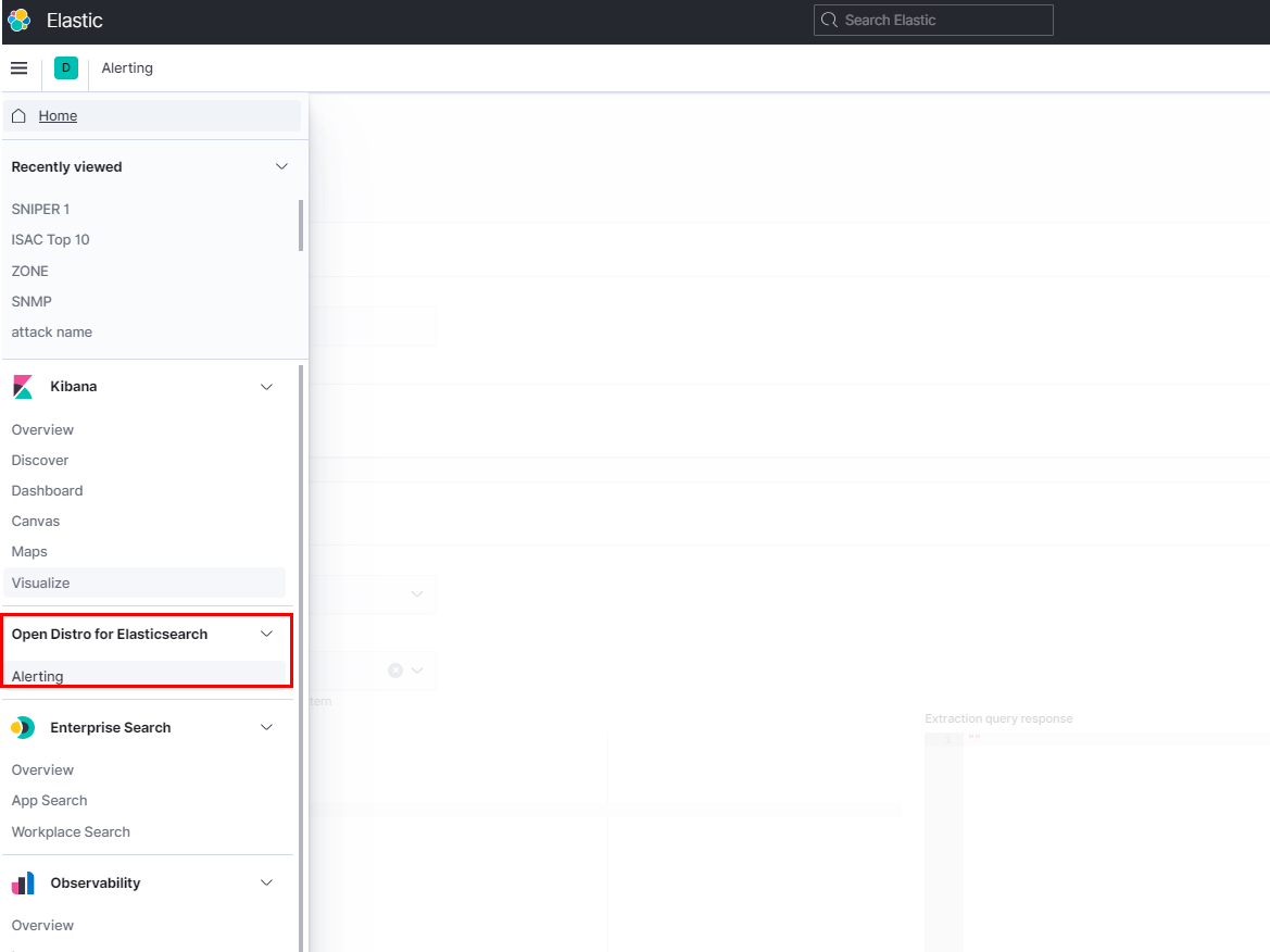 키바나 재실행 후 메뉴에 opendistro for elasticsearch alerting이 생겼으면 성공